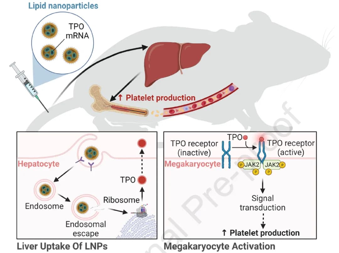 近日,来自上海交通大学医学院的徐颖洁、樊雪梅团队利用化学修饰核苷酸,结合脂质纳米颗粒(LNP)递送系统研发出一款有效改善血小板数量异常减少状况的TPO mRNA-LNP。